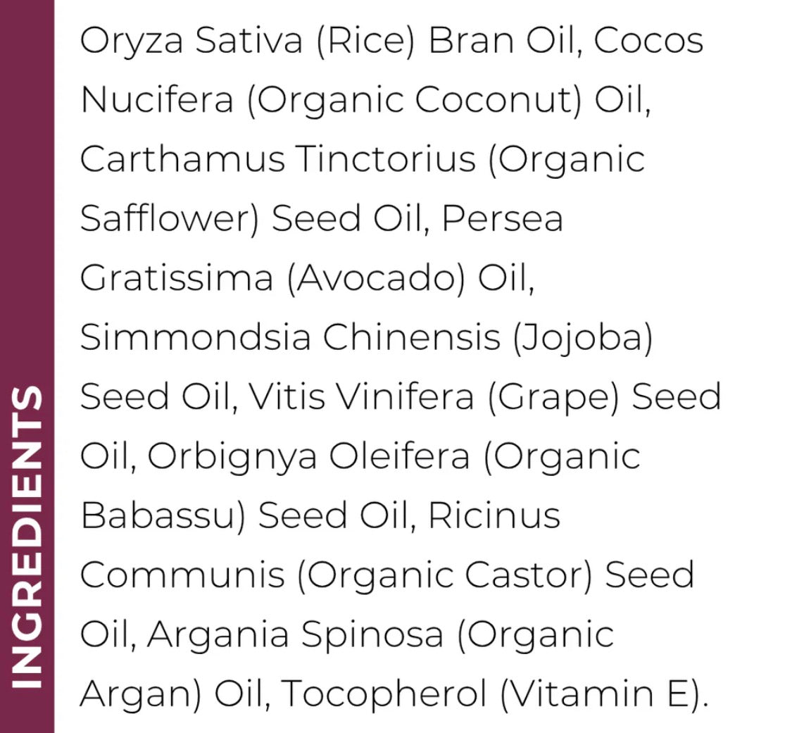 Rice Bran Oil, Organic Coconut Oil, Organic Safflower Seed Oil, Jojoba Oil, Grape Seed Oil, Organic Babassu Oil, Organic Castor Oil, Organic Argan Oil, Vitamin E