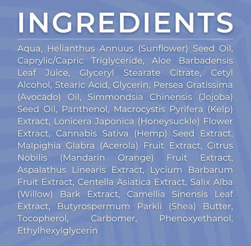 Aqua, Organic Sunflower Seed Oil, Organic Aloe Leaf Juice, Caprylic/Capric Triglyceride, Cyceryl Stearate Citrate, Cetyl Alcohol, Glycerin (Plant-Derived), Niacinamide, Hyaluronic Acid, Stearic Acid, Avocado Oil, Organic Jojoba Seed Oil, Cloudberry Seed Oil, Vitamin B5, Acrylates/C10-30 Alkyl Acrylate Crosspolymer, Organic Green Tea Leaf Extract, Phenoxyethanol, Sodium
